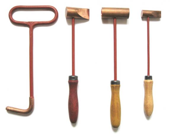 Дополнительный инструмент, необходимый для пайки жил, с помощью паяльника медного жарового конусного ПЛМ-1А и паяльник медный жаровой стаканчиковый ПЛМ-1Б зависит в основном от принятой технологии пайки. При соединении и ответвлении жил непосредственным сплавлением припоя в форме или медной гильзе применяют паяльники медный жаровой конусный ПЛМ-1 и паяльник стаканчиковый ПЛМ-1Б в сочетании с бензиновой паяльной лампой или пропан-бутановой горелкой. Для пайки жил в формах или медных гильзах поливом применяют паяльник медный жаровой стаканчиковый ПЛМ-1Б, емкость короб резервуар для припоя КСМ-25х10х75 и термометр для замера его температуры.