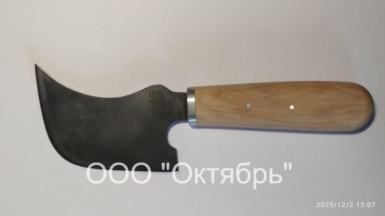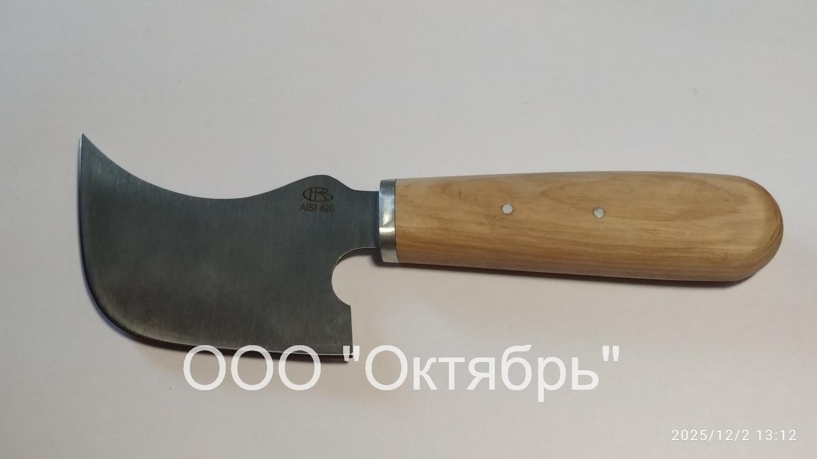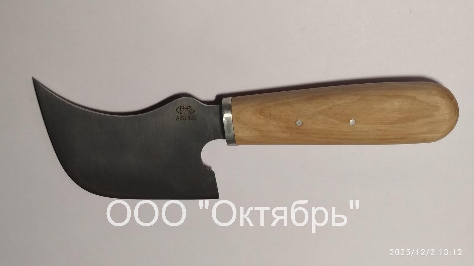 Нож серповидный отрезной широкий, базовая модель артикул С-945, применяется для монтажных, монтерских, ремонтных и др. работ в случае когда эти работы невозможно выполнить лезвием обычной формы. Конструкция ножа обеспечивает удобство, безопасность и качество выполнения работ. Ножом данного вида можно производить работы по резке и рубке материалов. Предусмотрен выпуск различных моделей ножа данного вида в зависимости от его назначения по согласованию с заказчиком. Комплектуется чехлом по заказу.